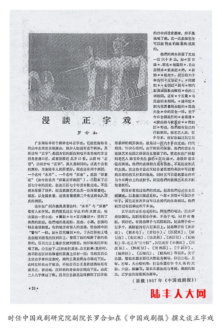 1954年,周恩来总理在省府礼堂观看了正字戏《百日缘》,主演陈宝寿、蔡十二和音乐分别获特别奖和集体奖。1956年夏,陈毅元帅等国家领导人和时任中国剧协主席田汉,在广州观看了正字戏《百日缘》《百花赠剑》《古城会》的演出,并上台亲切接见,予以赞许和鼓励。1957年文化部在广州举办了第三届中国戏曲演员讲习班,正字戏《百花赠剑》在讲习班演出,被著名京剧导演阿甲、戏剧专家郭汉城选为教材,同时原中国戏剧研究院副院长罗合如还在《中国戏剧报》载文好评,评说正字戏的音乐唱腔很好听,表演优美细致,有的地方有惊人的表演,恰如诗中的“警句”一般,还派女儿罗娜辉到双喜正字剧团即今陆丰市正字戏传承保护中心学艺三年。