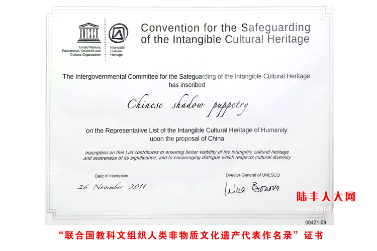 2006年陆丰皮影入选首批国家级非物质文化遗产代表作名录。2011年11月27日,中国皮影戏(含陆丰皮影戏)参评世遗,被联合国教科文组织公布列入世界人类非物质文化遗产名录,陆丰皮影戏是汕尾市首个也是唯一被评为“世遗”的项目。